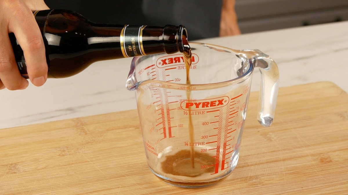 Verrühre das Schwarzbier mit dem Espressopulver und dem Vanilleextrakt – keine Sorge, du hast dich beim Schwarzbier nicht verlesen. Schwarzbier ist tatsächlich eine Geheimzutat unter Profis. In Kombination mit den übrigen Zutaten verleiht das Schwarzbier deinem Schokokuchen eine ganz besondere Note.