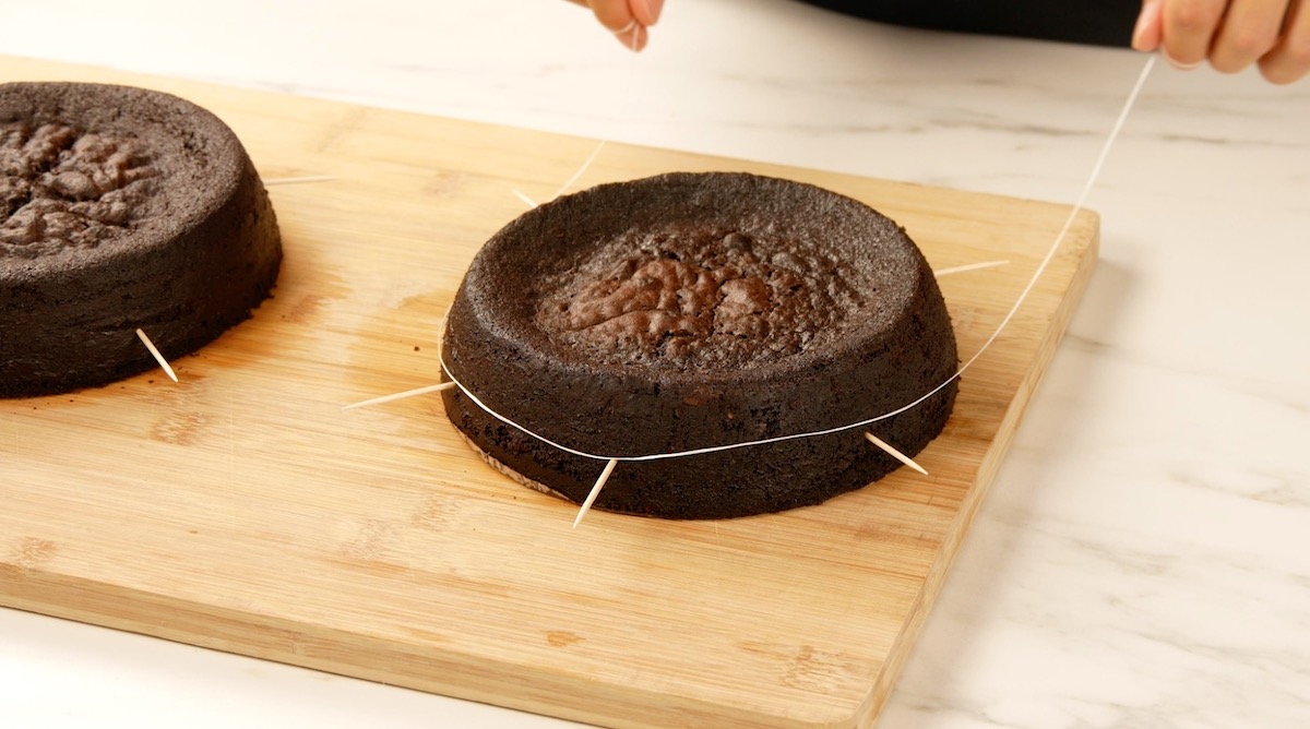 Jetzt geht es an den kreativen Teil, denn dein finaler Schokoladenkuchen soll ja in mehrere Schichten eingeteilt werden. Das klingt allerdings komplizierter, als es tatsächlich ist. Wenn du den folgenden Trick anwendest, sind Kuchenschichten ab heute ein Klacks für dich: Stecke rundherum Zahnstocher auf gleicher Höhe in beide Schokokuchen. Lege Zahnseide auf die Zahnstocher und ziehe die Zahnseide vorne vorsichtig zusammen, sodass sie den Kuchen durchschneidet. Entferne anschließend die Zahnstocher.