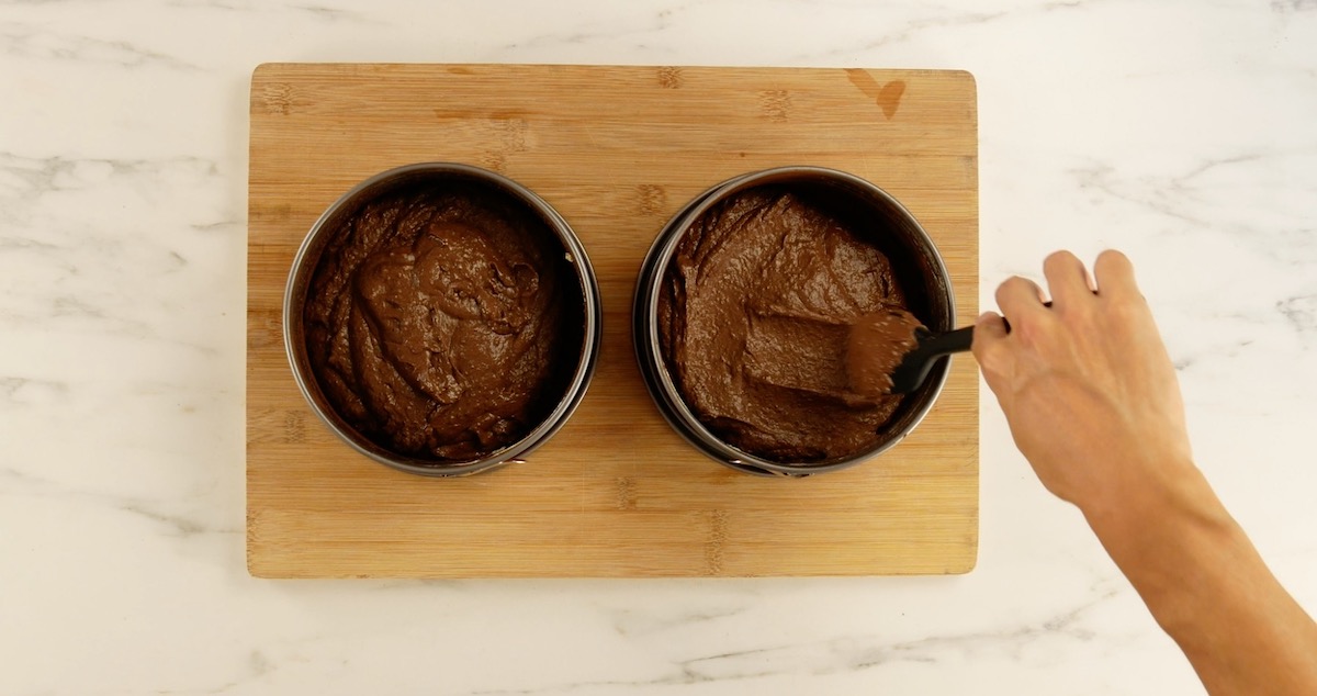 Teile den Teig nun gleichmäßig auf die beiden Springformen auf. Lass dir dabei jedoch nicht allzu viel Zeit, der Kuchenteig sollte nämlich nicht zu lange stehen, denn das Backpulver arbeitet ziemlich schnell. Backe die Schokokuchen nun im bereits vorgeheizten Backofen für 35 Minuten bei 160 °C Umluft.