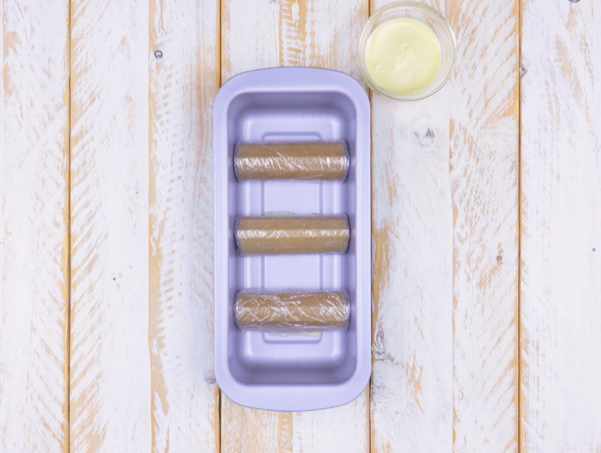 2.) Fette dann die Kastenform ein. Bestreiche dann die Pappformen an der Unterseite mit geschmolzener weißer Schokolade und setze sie in die Kastenform ein.