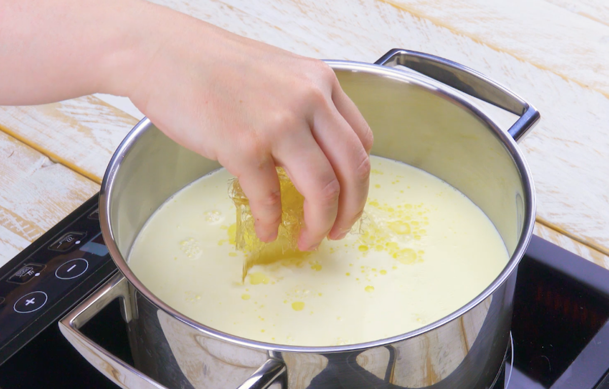 4.) Drücke die Gelatine aus und gib sie unter ständigem Rühren ebenfalls in den Topf, bis sie sich vollständig aufgelöst hat.