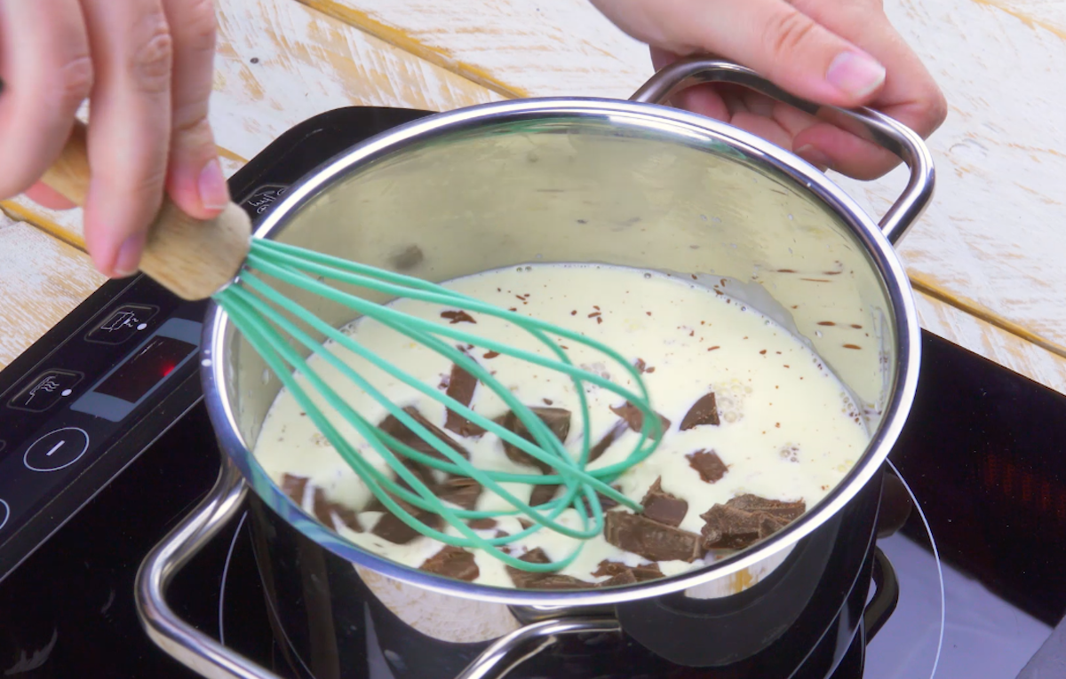 7.) Für die Glasur musst du die gehackte Vollmilchschokolade erwärmen und glattrühren.