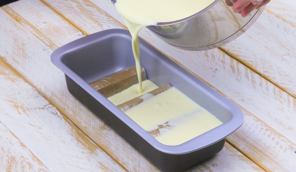 5.) Gieße nun die Sahnecreme in die Kastenform ein (über die Hohlformen) und stelle sie 3 Stunden lang in den Kühlschrank, bis sie fest geworden ist.