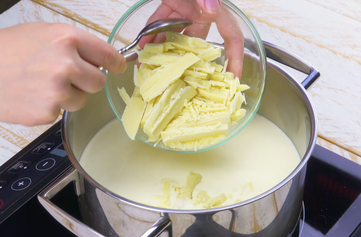 3.) Erhitze als Nächstes die Sahne in einem Topf (nicht kochen lassen!) und gib die weiße Schokolade und das Vanillearoma hinzu.