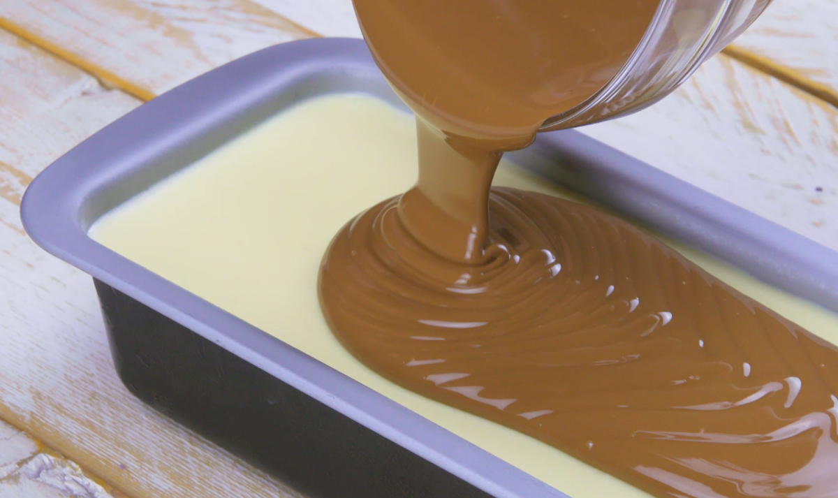 6.) Erwärme die Vollmilchschokolade für den Boden über einem Wasserbad und gieße sie vorsichtig über die Creme in der Kastenform. Dann musst du die Kastenform erneut für 30 Minuten kaltstellen.