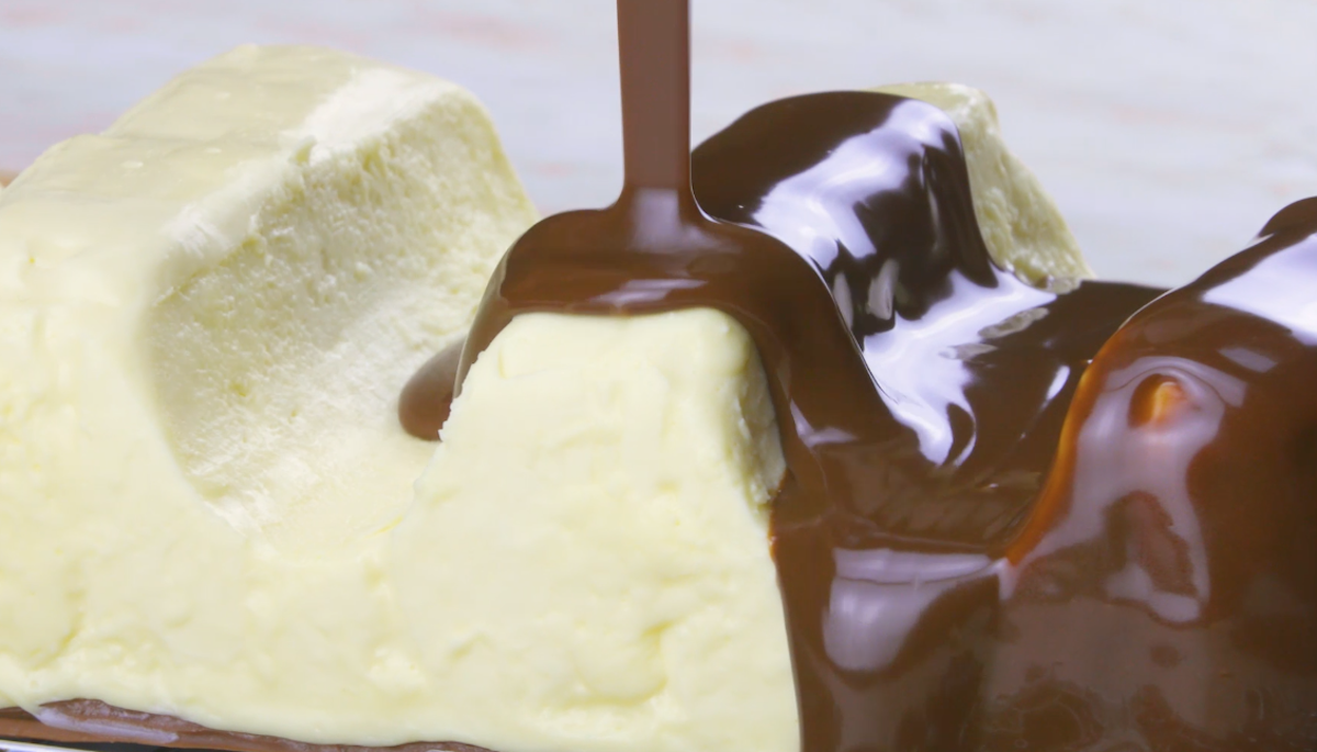 8.) Löse die Creme aus der Form und stürze sie auf ein Gitter. Entferne die Papphohlformen und gieße die Schokoladenglasur über den Riegel.