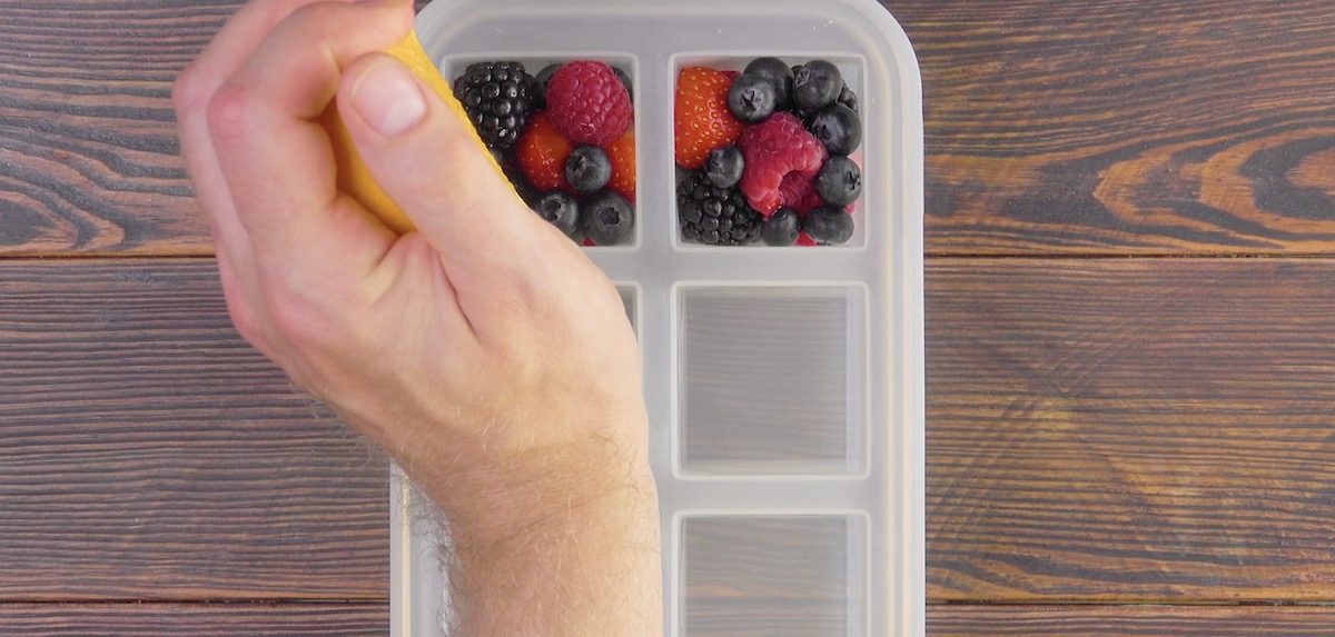 1.) Platziere die gemischten Früchte in zwei der acht Eiswürfelkammern und übergieße sie mit dem Saft einer ausgepressten Orange.