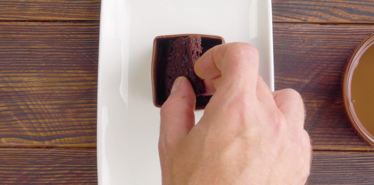 18.) Lege den Schokoladenwürfel mit einem entsprechend großen Brownie aus.