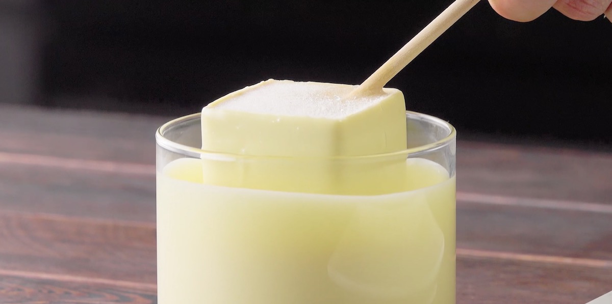 4.) Weiche die Gelatine ein. Erwärme währenddessen die Milch zusammen mit der Vanille, drücke dann die Gelatine aus und löse sie in der Vanillemilch auf. Zerhacke die weiße Schokolade und schmilz sie in der Milch. Hebe zum Schluss die Schlagsahne unter – fülle dieses weiße Schokomousse jetzt in die letzten zwei Eiswürfelkammern.