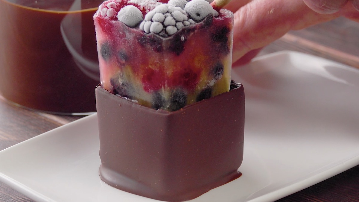 7.) Warte, bis die Schokolade wieder fest geworden ist, und ziehe den fruchtigen Eiswürfel heraus.