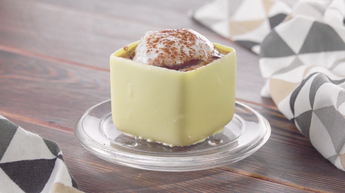 15.) Fülle die Schokokaffeecreme jetzt in den weißen Schokoladenwürfel und dekoriere die Köstlichkeit mit etwas Milchschaum und Kakaopulver.
