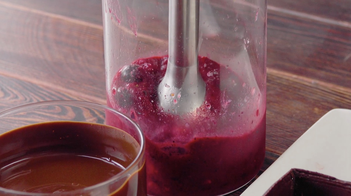6.) Löse nun als Erstes die zwei Eiswürfel mit den Beeren aus der Form und tauche sie abwechselnd so in geschmolzene dunkle Schokolade, dass die Früchte oben noch zu sehen sind.