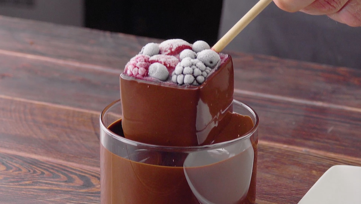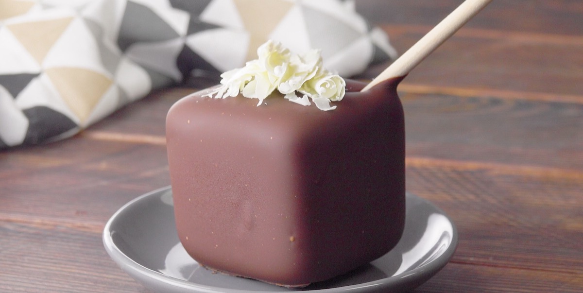 21.) Löse schließlich noch die Schokomousseeiswürfel aus der Form und tunke sie komplett in geschmolzene dunkle Schokolade.