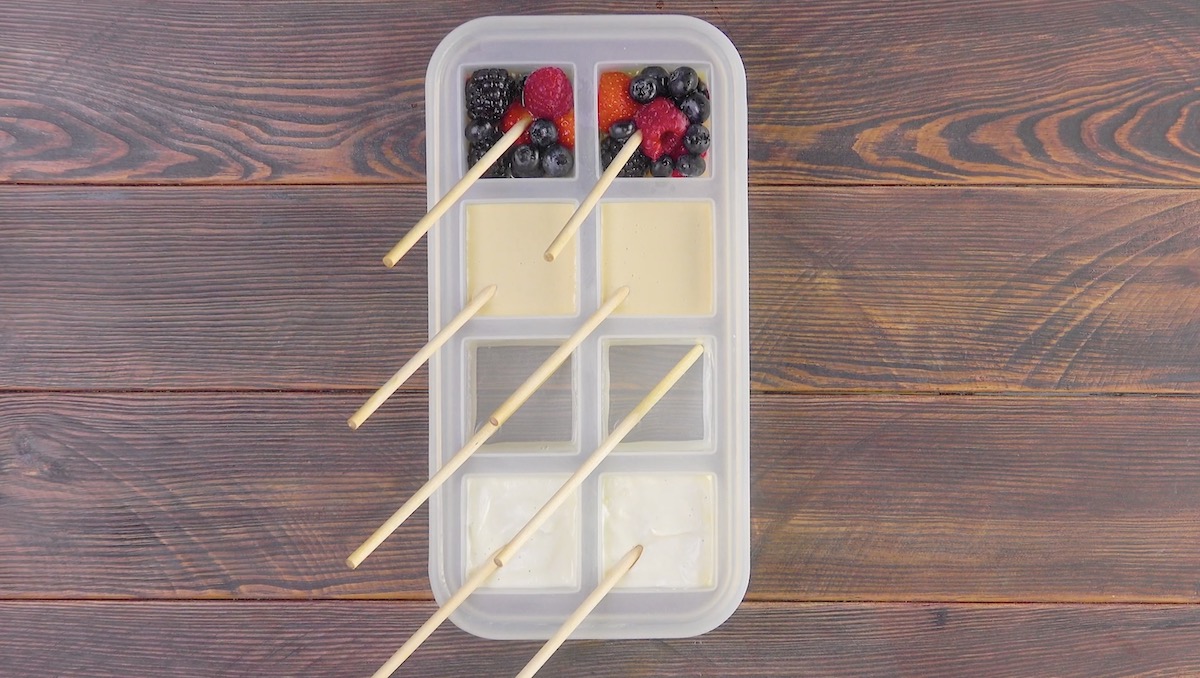 5.) Lege zum Abschluss in jede Eiswürfelkammer einen Holzspieß und friere das Ganze ein, am besten für 24 Stunden.