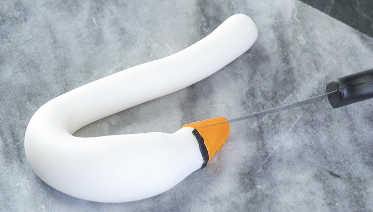 1. Als Erstes bereitest du den Schwanenhals zu, da er 48 Stunden trocknen muss. Forme aus weißem, orangefarbenem und schwarzem Fondant einen Schwanenhals mit Kopf. Stecke am unteren Ende einen Zahnstocher in das Fondant und lass es dann bei Raumtemperatur ca. 48 Stunden trocknen.