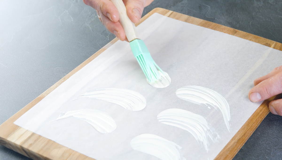 4. Kommen wir nun zu den Federn: Lege einen Streifen Backpapier auf ein Holzbrett. Gib weiße Schokolade in zwei Reihen Form von Punkten auf das Backpapier und streiche die erste Reihe dann mit einem Pinsel schwungvoll zur Seite. Wiederhole das spiegelverkehrt mit der anderen Reihe. Für den Kuchen braucht man von beiden Formtypen ungefähr 30 bis 40 Schokofedern. Lass die Schokolade bei Raumtemperatur anziehen und dann im Kühlschrank aushärten.
