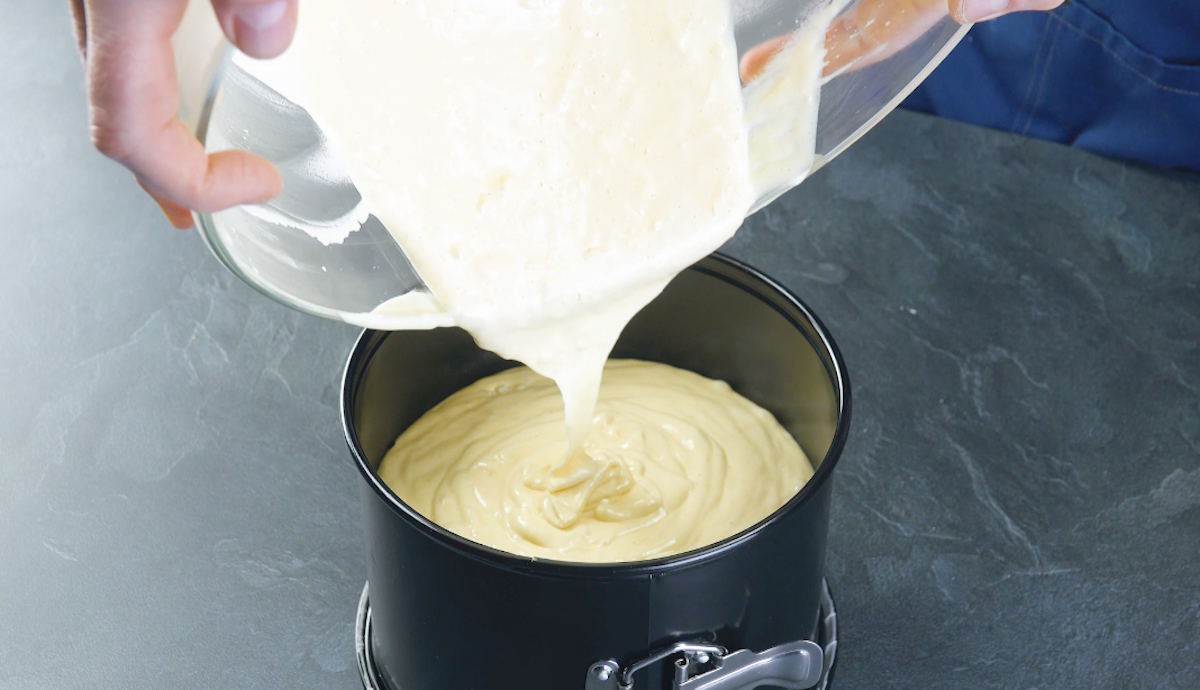 2. Schlage nun Eiweiß in einer Schüssel auf und gib nach und nach Zucker hinzu. Schlage alles zu einem festen Baiser auf. Jetzt kommen die Eigelbe ebenfalls nach und nach dazu. Mische dann mit einem Teiglöffel Backpulver, Mehle und Milch unter. Gib den Teig in eine eingefettete und bemehlte Springform und backe ihn für 90 Minuten bei 170 °C Ober- und Unterhitze. Nach dem Backen muss der Kuchen vollständig auskühlen.