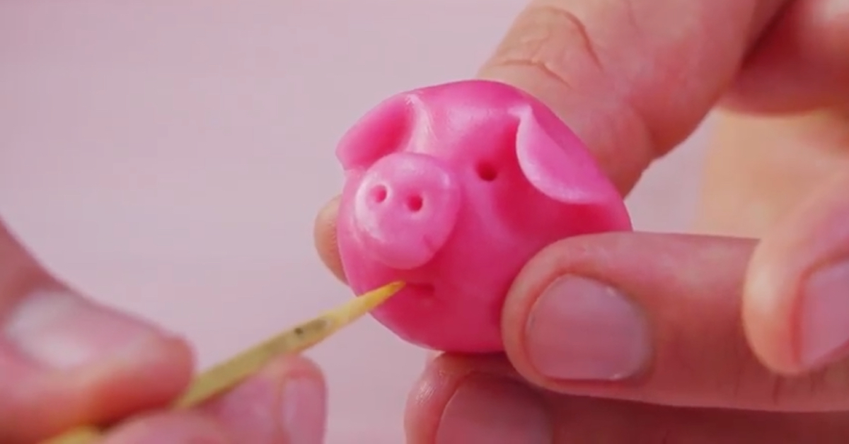 7.) Jetzt formst du aus dem rosafarbenen Fondant niedliche kleine Schweinchen. Gib ihnen entspannte Gesichter und eingerollte Öhrchen.