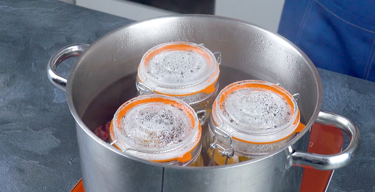3. Lege den Boden eines Topfes mit einem Geschirrtuch aus, stelle die Einweckgläser darauf und fülle den Topf zu drei Vierteln mit Wasser. Verschließe den Topf und erhitze das Wasser, reduziere die Temperatur, sobald das Wasser zu kochen beginnt. Lass die mit Schweinenacken gefüllten Gläser dann für drei Stunden abgedeckt bei siedendem Wasser garen.