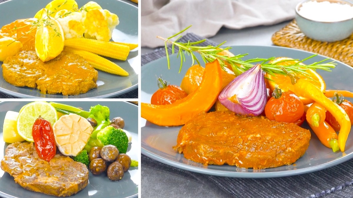 4. Hole die Gläser vorsichtig aus dem Topf, öffne sie und drapiere den Inhalt auf einem Teller – fertig ist dein Schweinenacken samt Beilagen aus dem Glas. Hier siehst du je einen Teller jeder Variante: