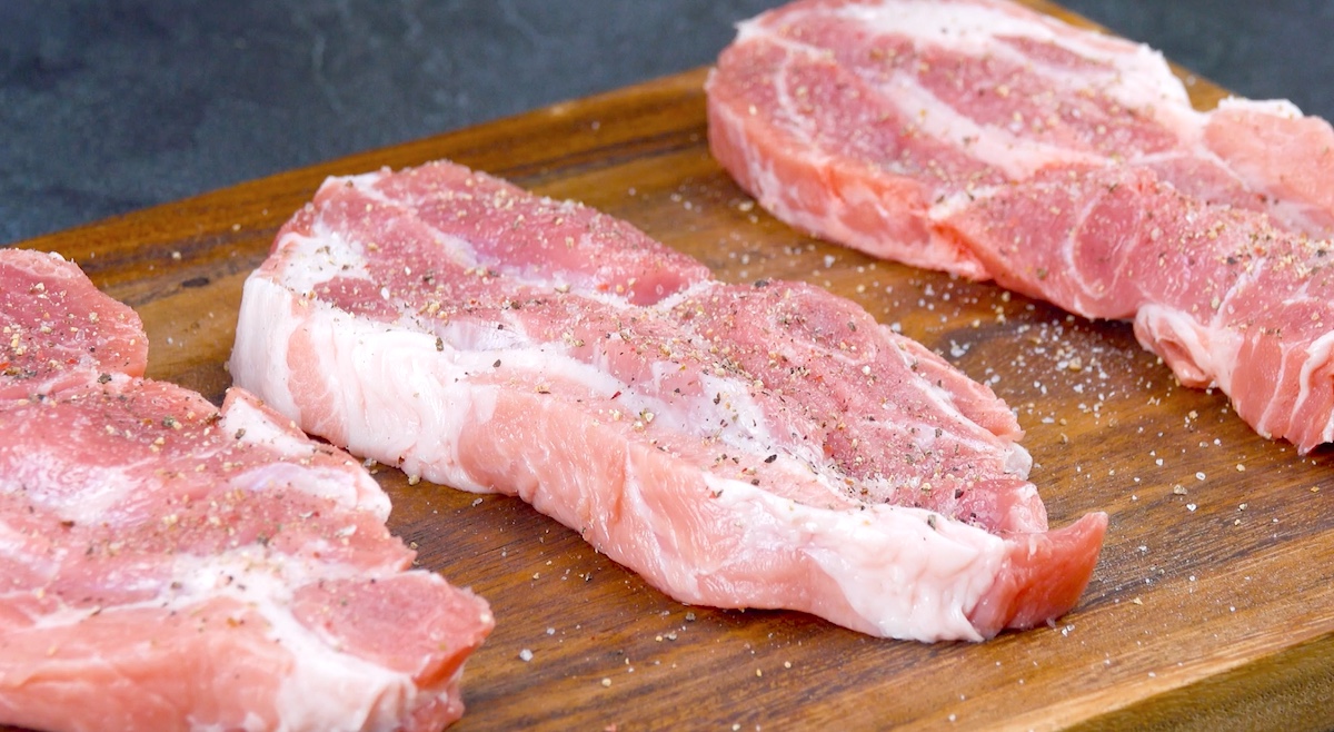 1. Schneide den Schweinenacken in drei gleich große Scheiben und salze sowie pfeffre diese von beiden Seiten.