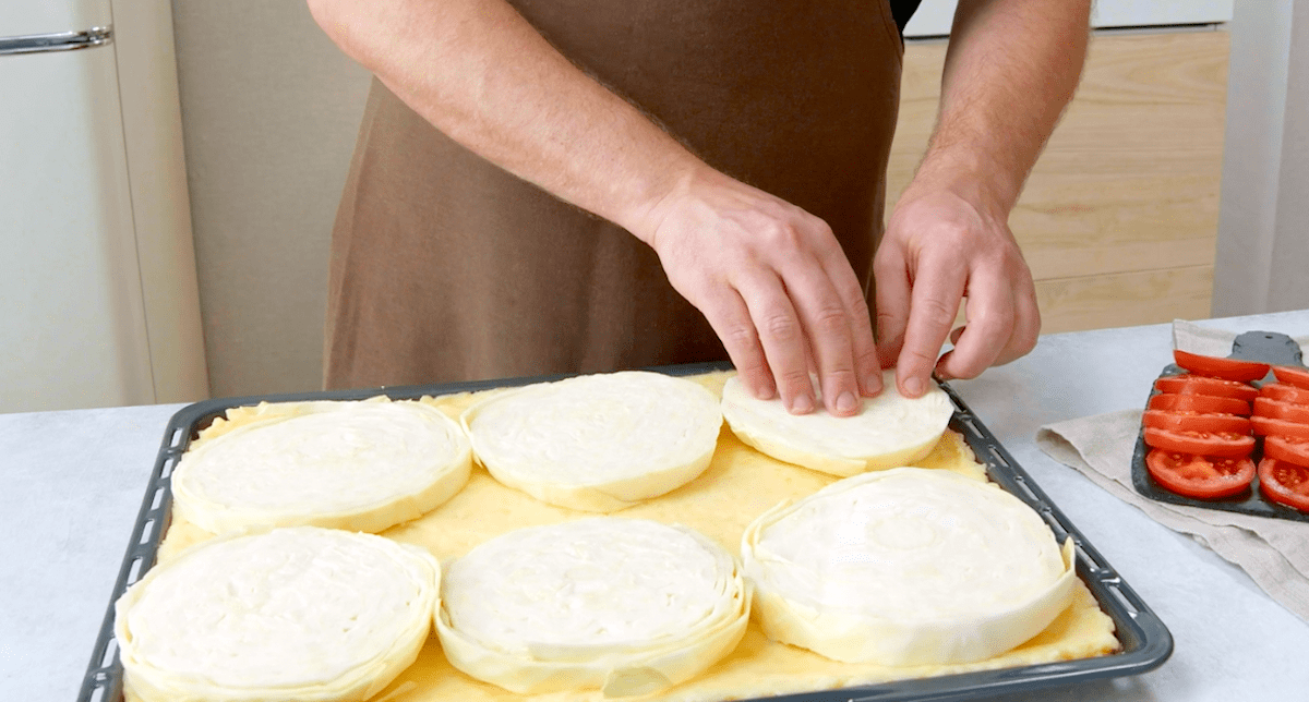 8. Lege auf jede Weißkohlscheibe ein Stück marinierten Schweinenacken, bedecke jedes Stück mit Tomatenscheiben und bestreue diese wiederum mit Mozzarella.