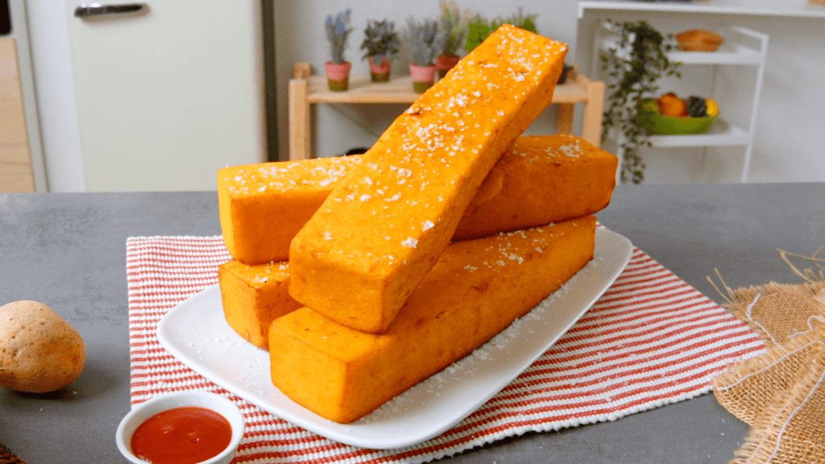 6. Löse die gebackene Kartoffelmasse aus der Form und schneide sie in 4 gleich große längliche Rechtecke, sodass sie aussehen wie riesige Pommes.