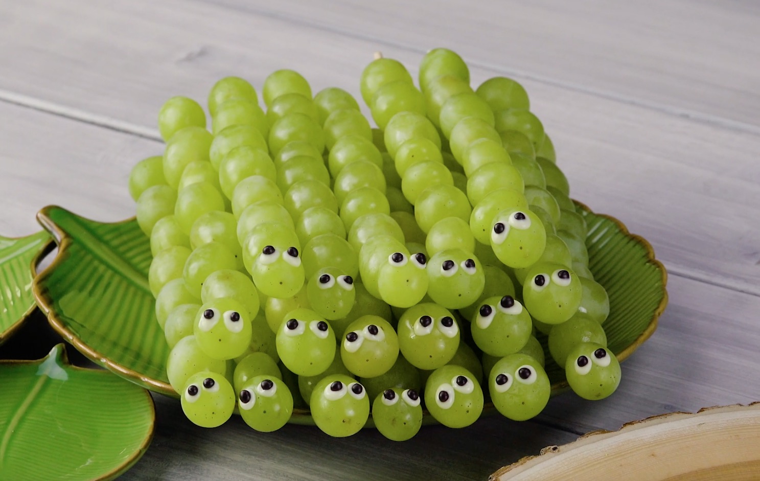 Stecke die Trauben auf den Schaschlikspieß. Gib zwei Tupfer der weißen Schokolade vorne auf die erste Traube und setze anschließend die Schokoperlen darauf. Dann ist das Würmchen bereit für den Verzehr!