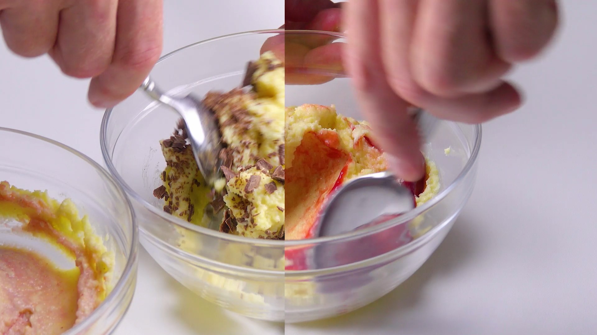 Teile die Grieß-Ricotta-Mischung nun in zwei Portionen: Eine vermischst du mit der roten Marmelade und die andere mit der Schokolade.