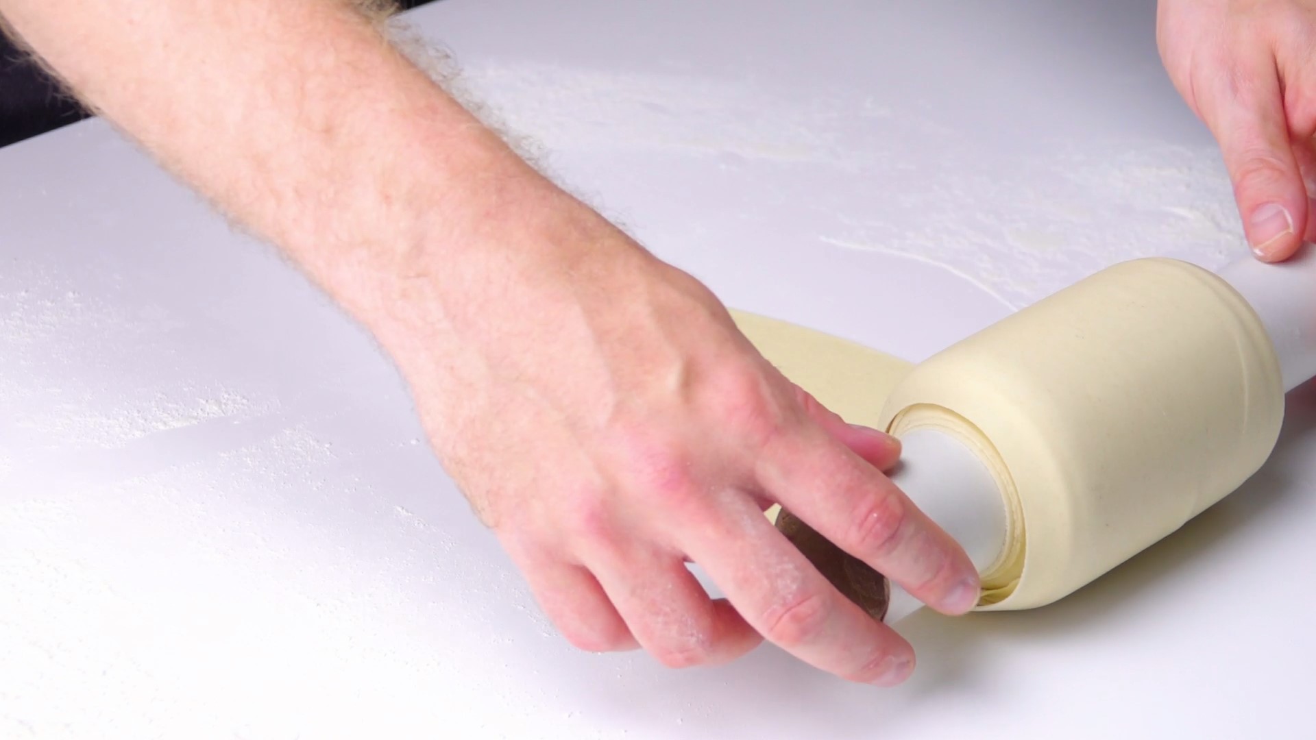 2.) Bestäube nun deine Arbeitsfläche nochmals mit etwas Mehl und rolle den Teig darauf dünn zu einem schmalen Oval aus. Rolle ihn danach auf eine Papprolle auf. Das Ganze kommt wieder in den Kühlschrank.