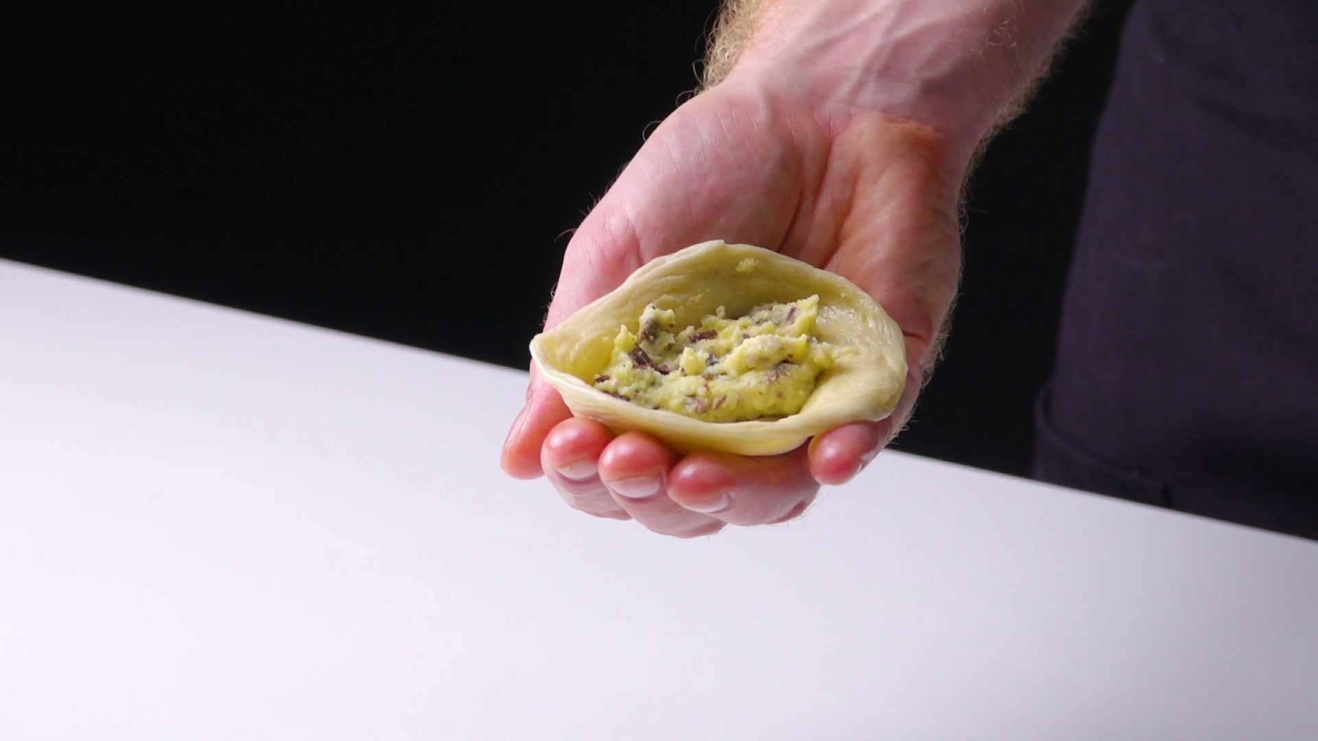 5.) Schneide nun etwa 1 cm breite Scheiben von der gekühlten Teigrolle ab. Jede Scheibe wird plattgedrückt und zu einer Art kleinem Schüsselchen geformt, das du dann mit der Füllung bestückst. Klappe nun eine Seite über die andere und verschließe das Teigwerk zu einer muschelartigen Form.