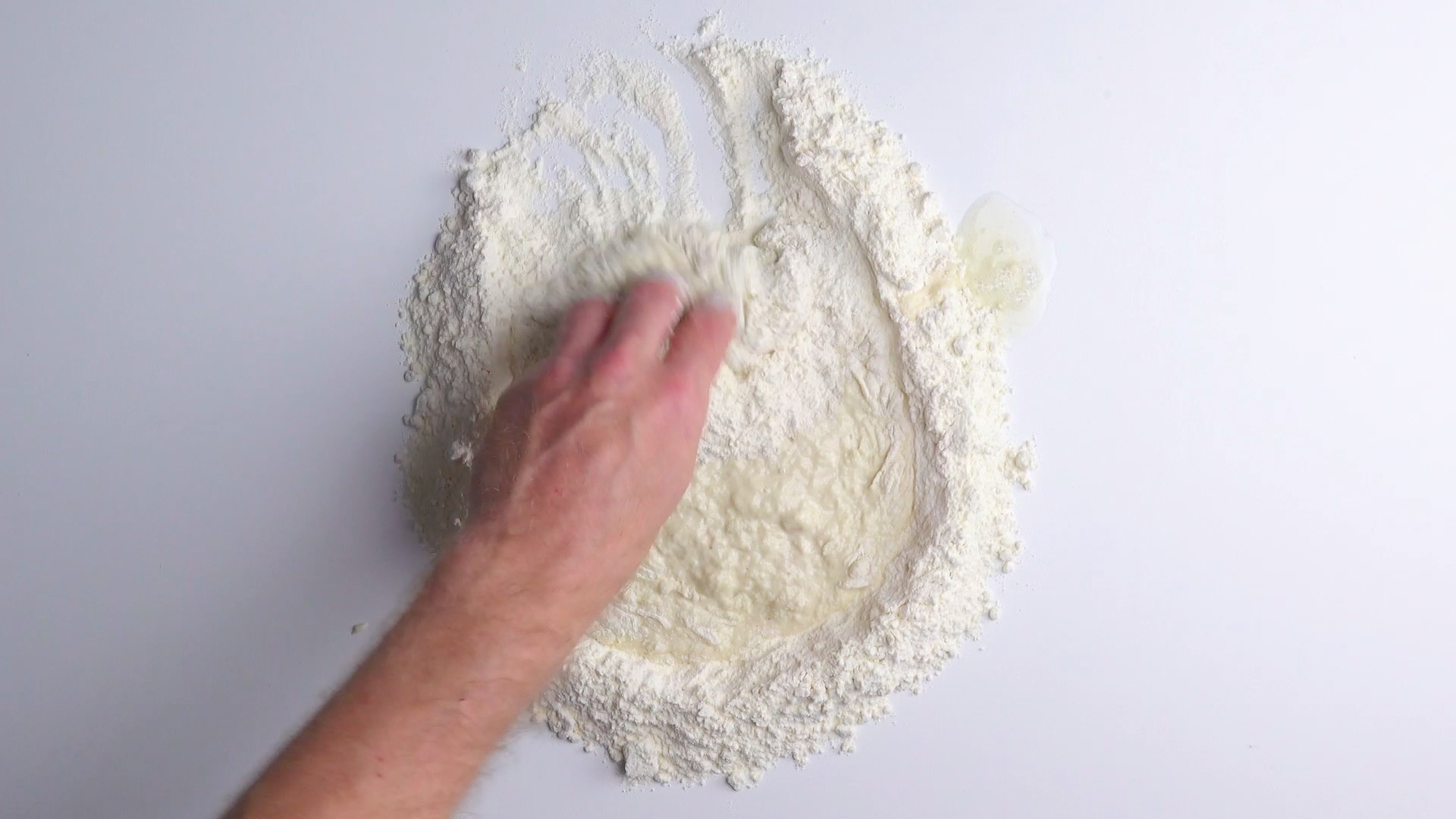 1.) Für den Teig schüttest du zunächst das Mehl kegelförmig auf deine Arbeitsfläche. Drücke anschließend in die Mitte eine Mulde und gieße das Wasser hinein. Anschließend kommen das Salz und der Honig dazu.