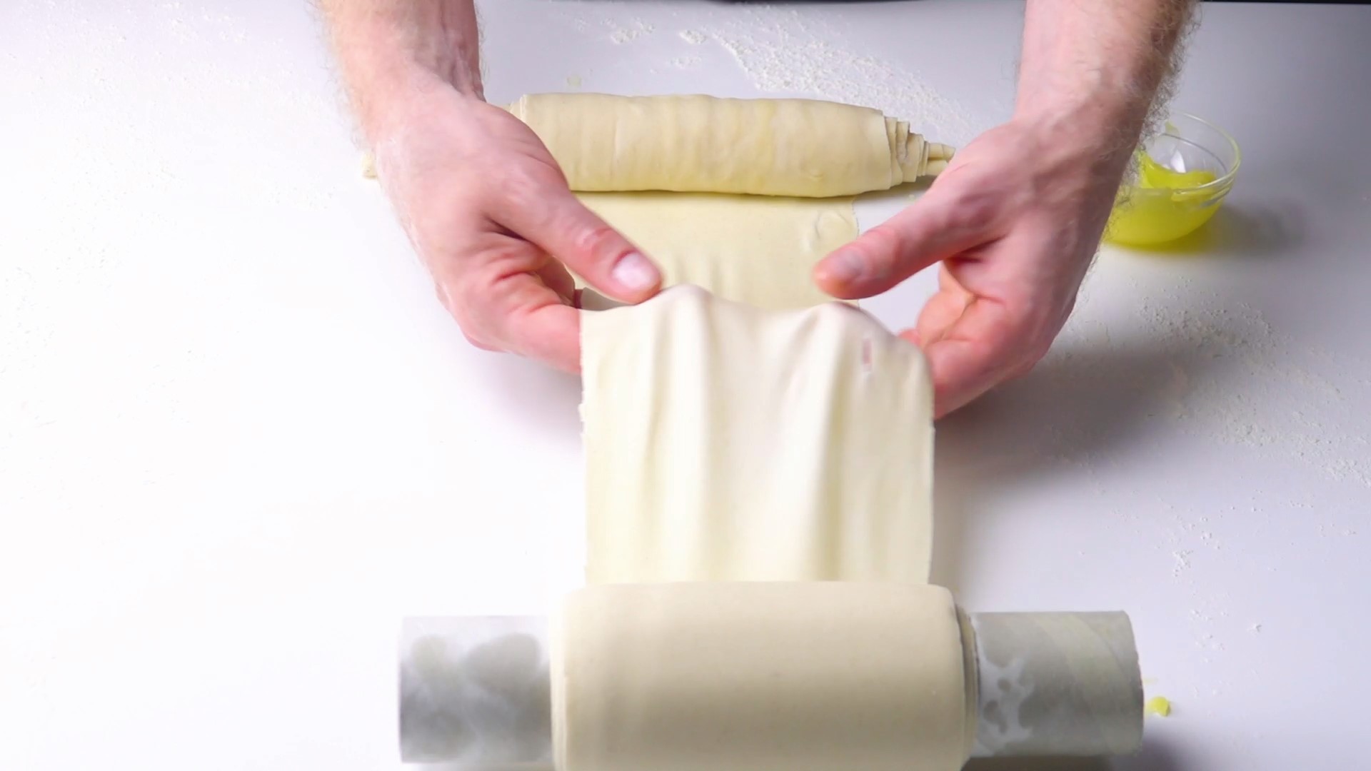 Wiederhole den Vorgang des Abrollens, Bestreichens und Wiederaufrollens noch zwei Mal, wobei der Teig jedes Mal ein Stück an Breite gewinnt.