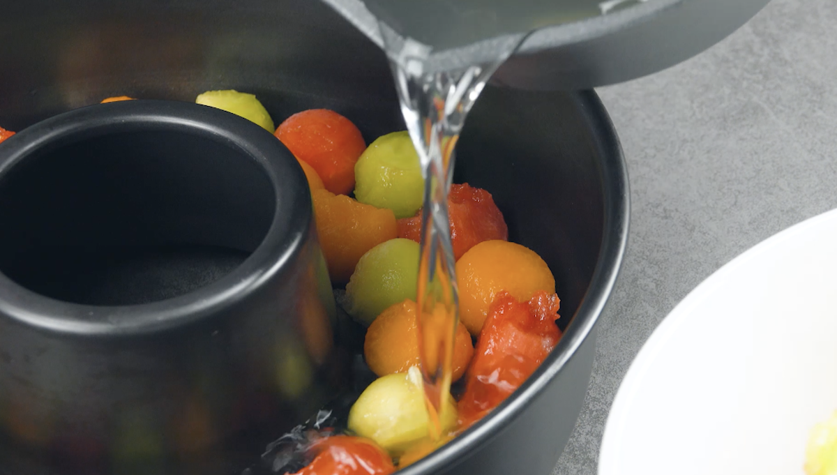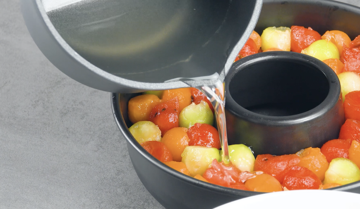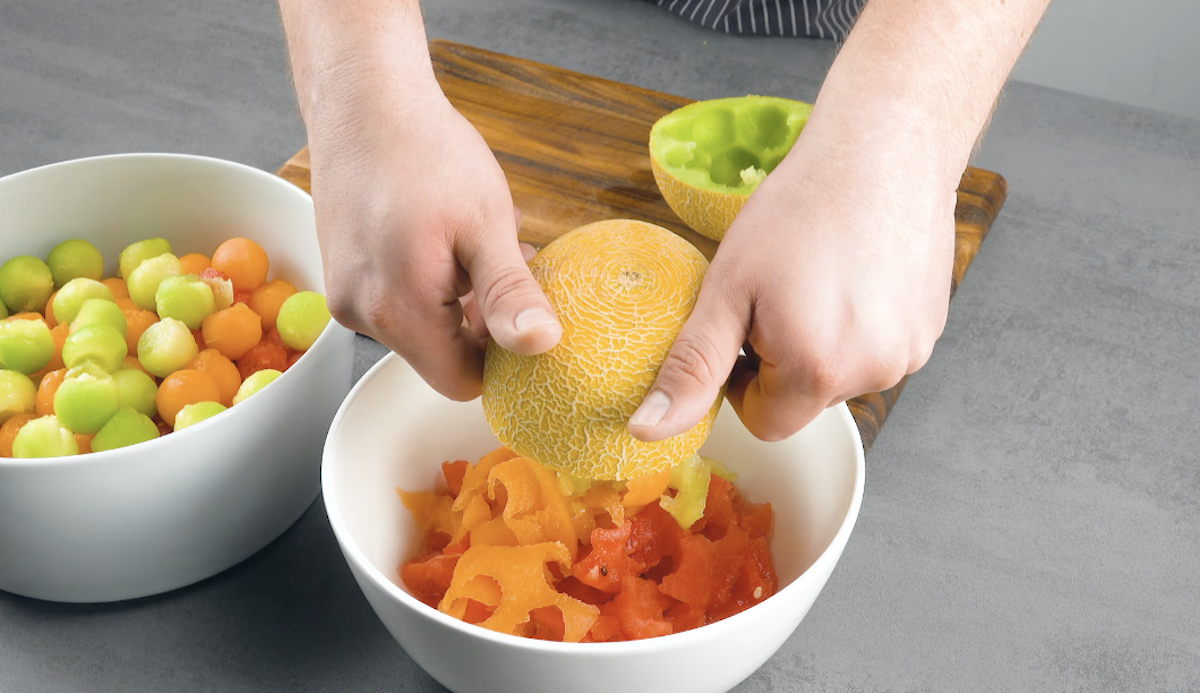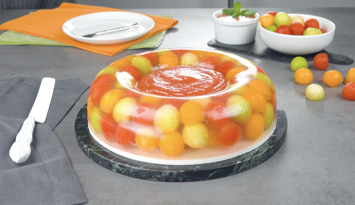 Wer sich im Sommer zwischen all den leckeren Melonenarten nicht entscheiden kann, sollte folgendes Rezept aufmerksam lesen. Wir bereiten ein herrlich frisches, sommerliches Dessert zu. Es besteht aus Wassermelone, Galiamelone und Cantaloupemelone. Alle 3 Melonenarten werden als kleine Bällchen in einer Kuchenform mit 2 Arten von Gelee serviert. Dazu gibt es noch eine erfrischende Melonensoße – und fertig ist das perfekte Sommerdessert.