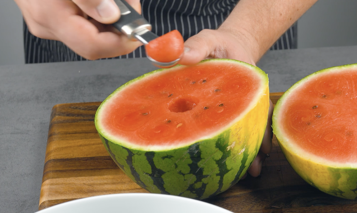 1. Halbiere die Wassermelone und stich ihr Fruchtfleisch komplett mit einem Kugelausstecher in kleinen Bällchen aus. Kratze das übrig gebliebene Fruchtfleisch mit einem Löffel aus der Melone und gib es samt Fruchtsaft in eine Schüssel.