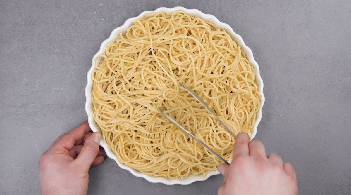 So geht es: 1.) Koche die Spaghetti in Salzwasser, gieße sie ab und lasse sie abkühlen. Fette die größere Tarteform mit Öl ein und verteile darin das Paniermehl.