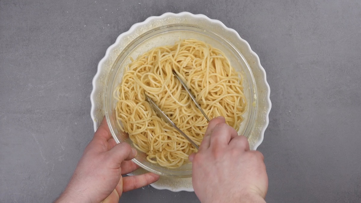 2.) Vermische die abgekühlten Spaghetti mit Eiern, Parmesan und Olivenöl.
