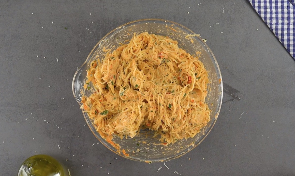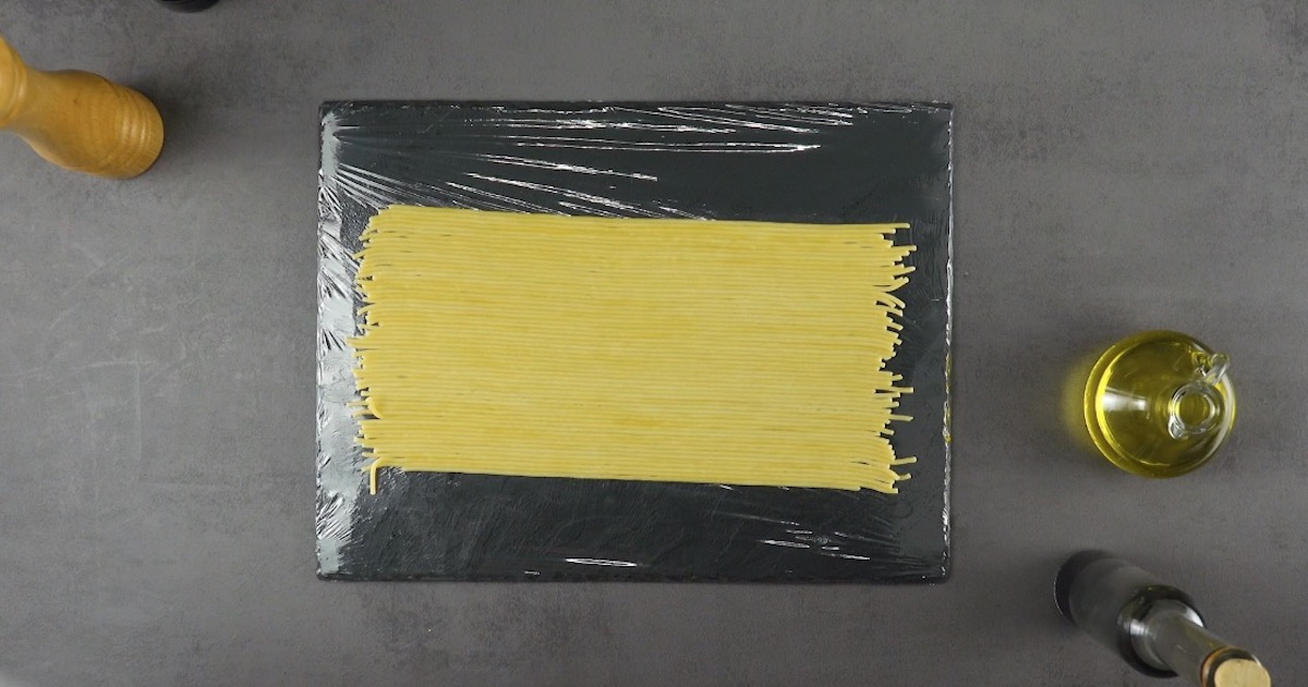 2.1) Koche die Spaghetti, schrecke sie leicht ab und lasse sie abkühlen. Lege Frischhaltefolie auf ein Brett und lege die einzelnen Nudeln Seit‘ an Seit‘ auf die Folie.