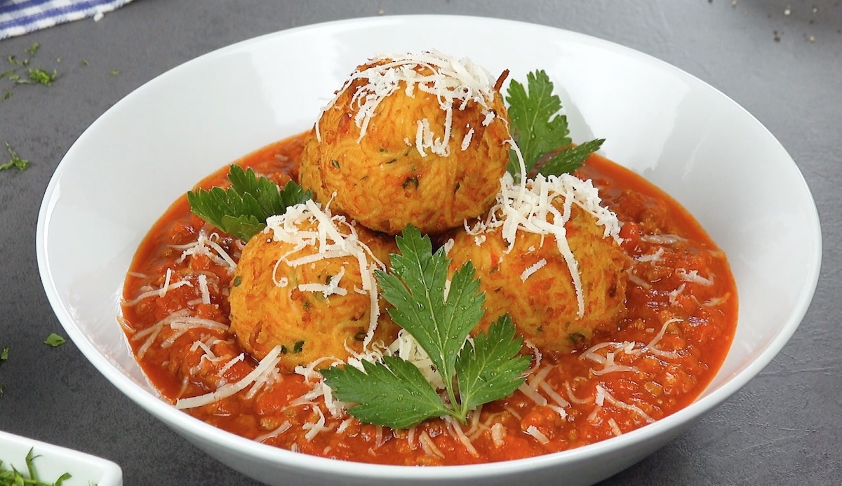 Serviere die fertig frittierten Nudel-Bälle mit fertiger Bolognesesoße, geriebenem Parmesan und glatter Petersilie.