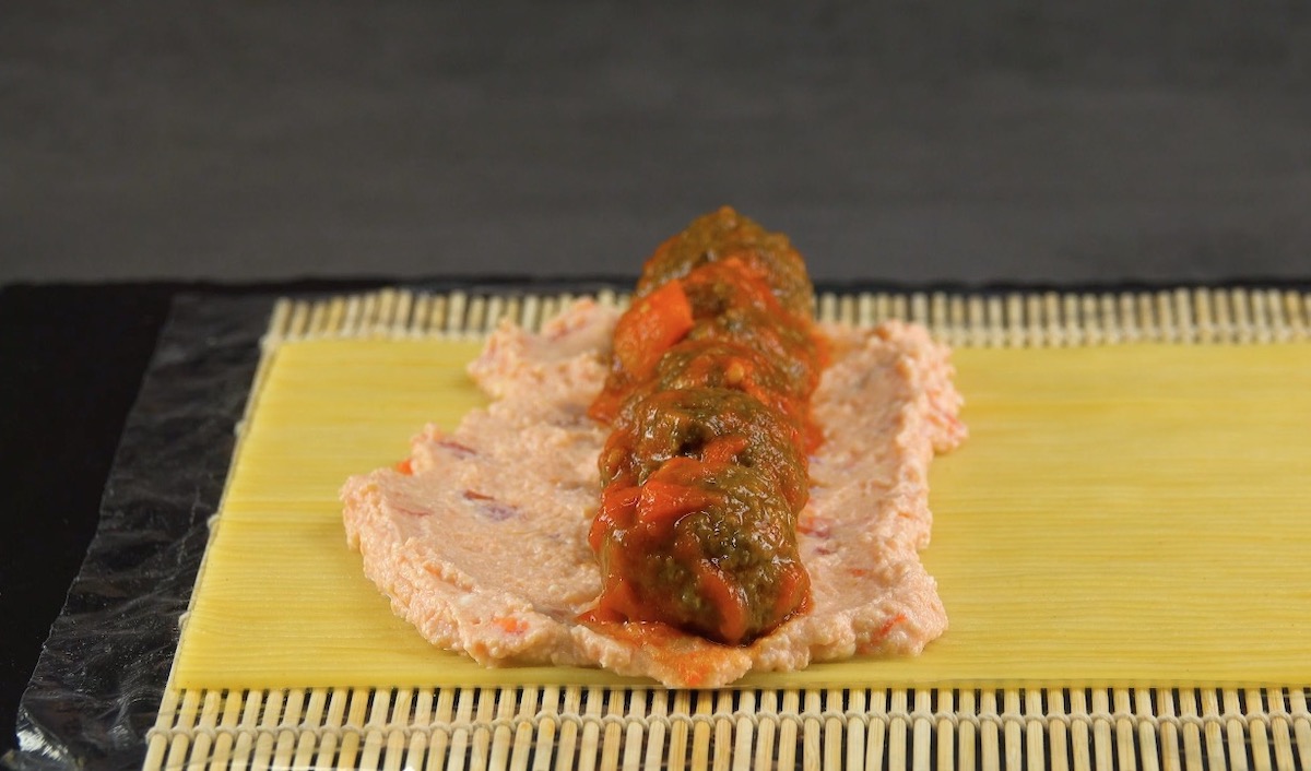 2.4) Platziere die auf der Folie liegende „Nudelmatte“ auf eine Sushimatte um. Verstreiche mit einem Löffel etwa 3 Esslöffel der Ricotta-Mischung auf dem linken Drittel der Nudeln (lasse einen kleinen Rand frei) und lege 5 fertige Fleischbällchen auf die Mischung.