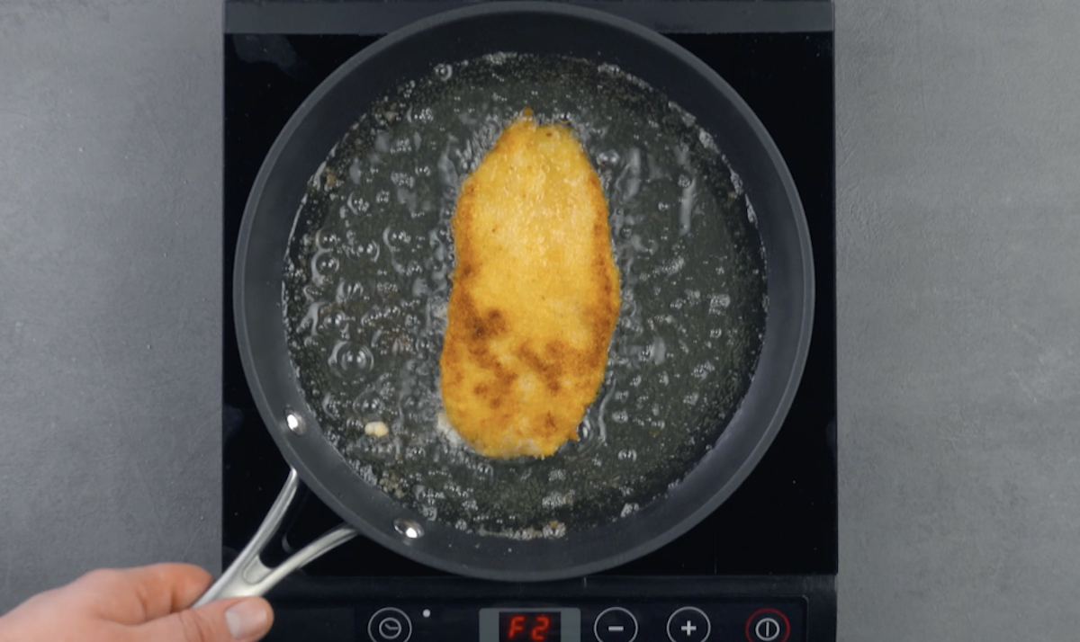 3.) Vermische Parmesan mit Semmelbröseln. Paniere dann die Schnitzel erst in Mehl, dann in Ei, dann in den Semmelbröseln. Backe die Schnitzel anschließend in heißem Fett aus.