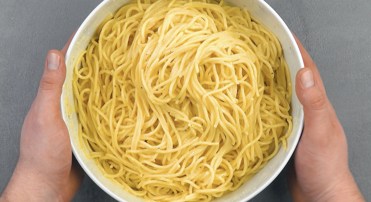 4.) Gib die gekochten Spaghetti in eine Schüssel und füge Sahne, geriebenen Parmesan, Eier, Pfeffer und Salz hinzu und vermenge alles miteinander.
