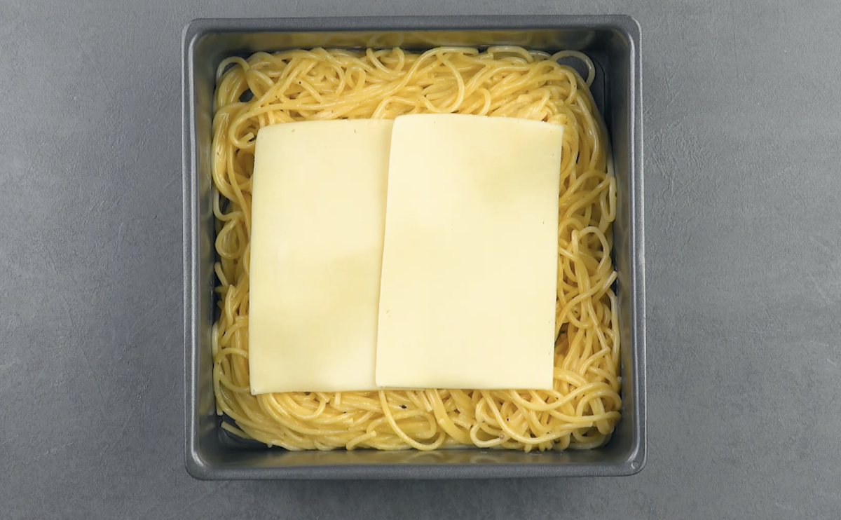 5.) Gib die Hälfte der Nudeln in eine eckige Backform und lege 2 Scheiben Käse darauf.