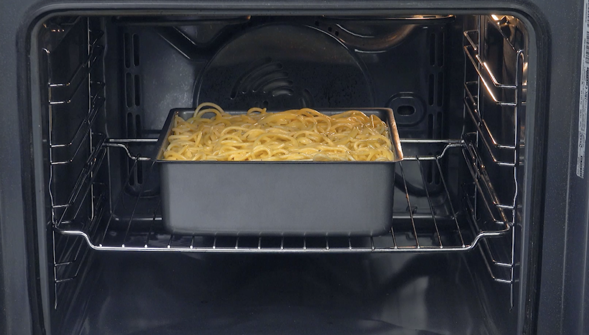 9.) In der Zwischenzeit kannst du die Tomatensoße zubereiten. Schwitze dafür Zwiebeln und Knoblauch in etwas Öl an und gib die passierten Tomaten hinzu. Würze die Soße mit Kräutern, Salz, Zucker und Pfeffer. Lasse alles ca. 5 Minuten köcheln. 10.) Gieße die Tomatensoße über die Spaghetti in der Form, bestreue alles mit geriebenem Käse und backe alles weitere 25 Minuten im Ofen.