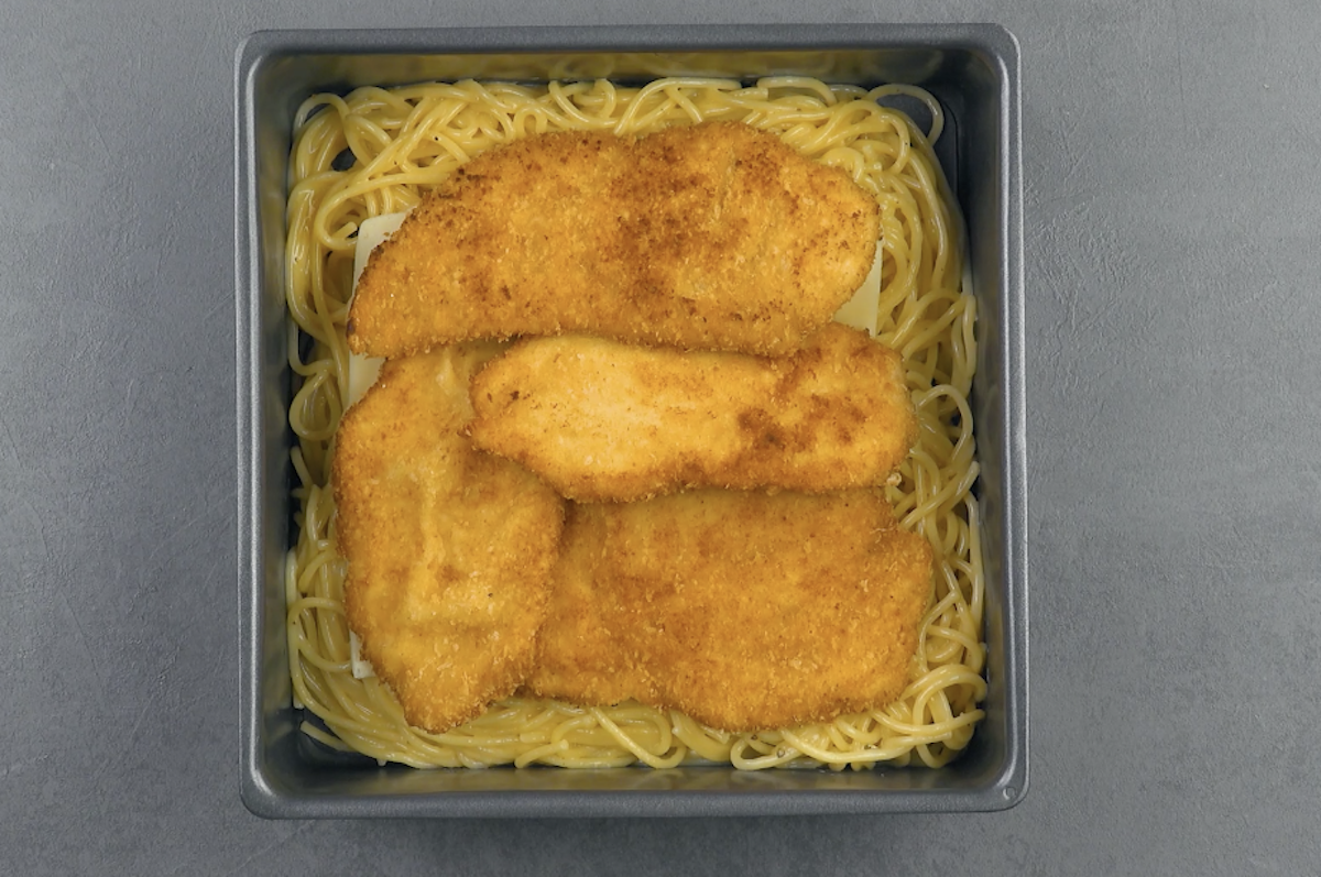 7.) Nun kommen weitere 2 Scheiben Käse auf die Schnitzel und abschließend die restlichen Spaghetti.