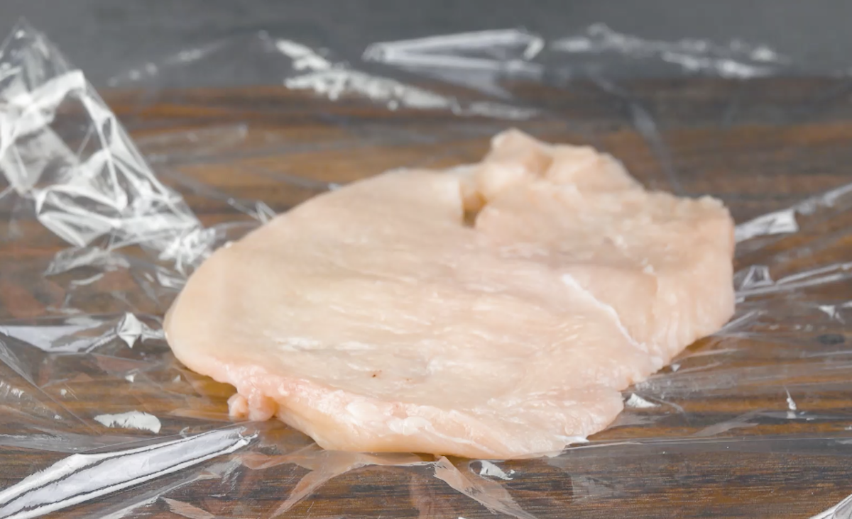 So geht es: 1.) Koche die Spaghetti in Salzwasser. 2.) Halbiere die Hühnerbrüste längs, sodass du 4 Schnitzel vor dir liegen hast. Plätte alle 4 Schnitzel mit einem Fleischklopfer. Würze das Fleisch mit Salz und Pfeffer.