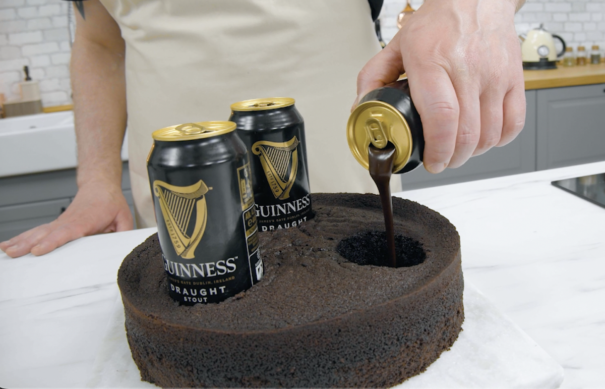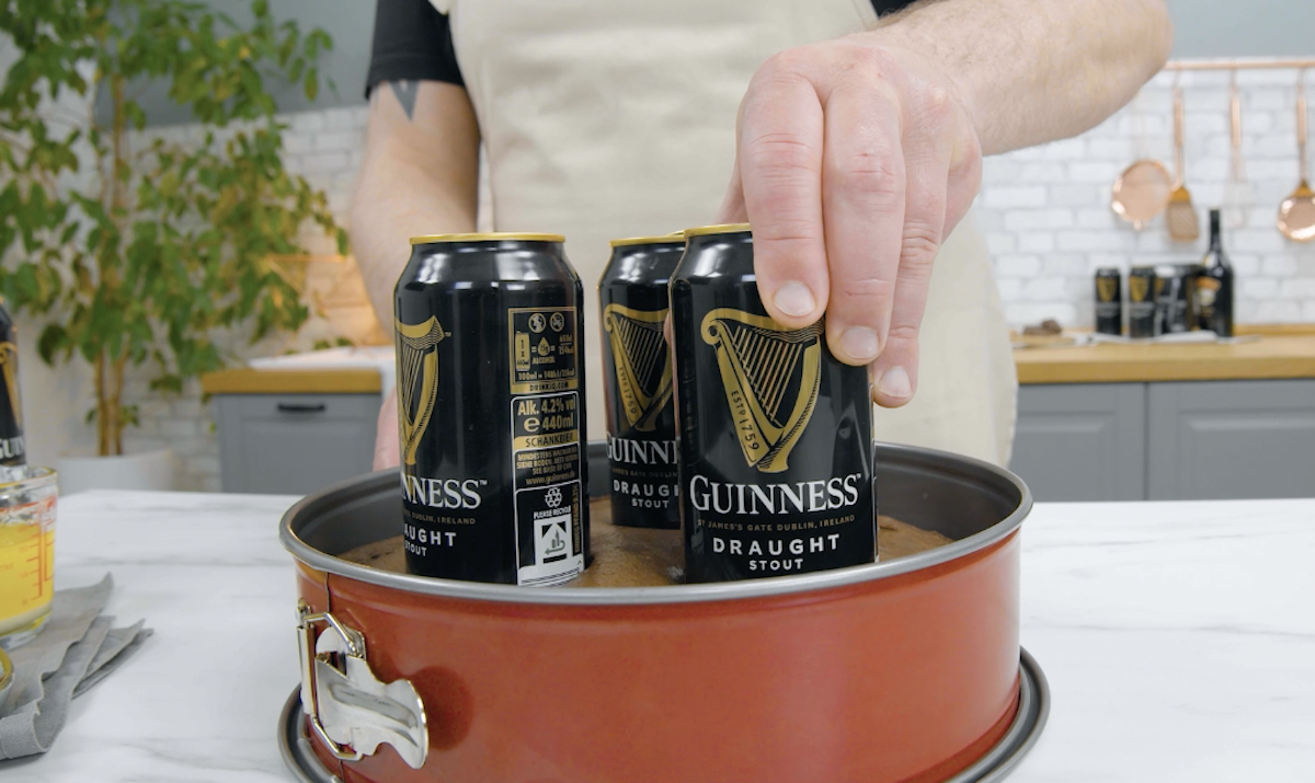 2. Gib in die drei Guinness-Dosen jeweils die gleiche Menge an Kakaopulver, Zucker, flüssiger Butter und geschmolzener Schokolade. Drücke die Dosen dann gleichmäßig verteilt in den Teig und stelle die Form samt Dosen für 45-60 Minuten in den Ofen.