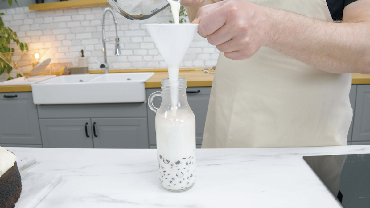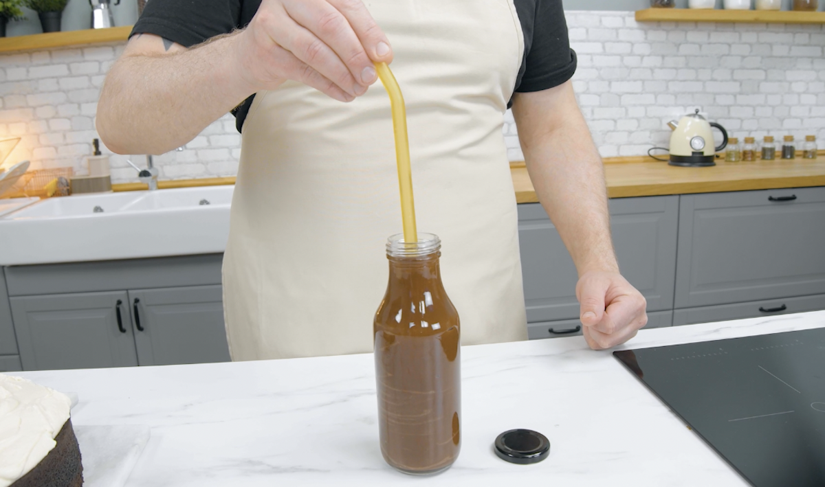 5. Fülle die kleingehackte Zartbitterschokolade in die Glasflasche. Koche dann die Sahne auf und gieße sie hinzu, solange sie noch heiß ist. Verschließe die Flasche und schüttele sie, bis die Masse homogen ist. Drehe den Deckel wieder ab und lasse die Ganache auf ca. 20 °C abkühlen. Friere in dieser Zeit den Glasstrohhalm für 30 Minuten ein.