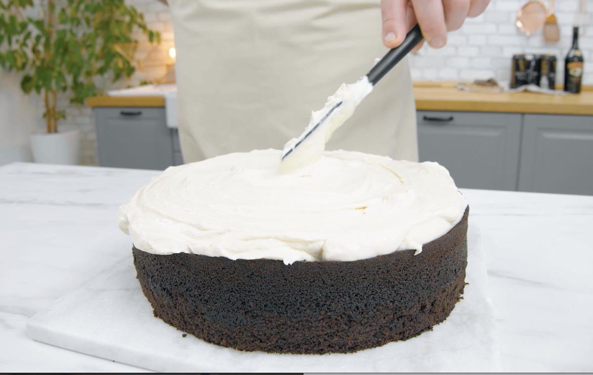 4. Für das Frosting schlägst du Frischkäse auf. Gib nach und nach Puderzucker hinzu. Rühre dann Baileys unter den Frischkäse. Hebe außerdem die geschlagene Sahne unter. Verziere die Oberseite des Kuchens mit dem Frosting.