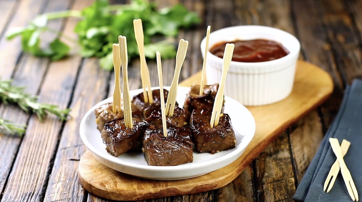 Wenn von Steak die Rede ist, denken die meisten vermutlich an ein großes Stück Fleisch, das fast den gesamten Teller einnimmt. Dass ein Steak aber auch kleiner und handlicher daherkommen kann, beweisen diese mundgerechten Steak-Happen. Die wahre Brillanz dieser Steak-Happen liegt allerdings nicht nur in ihrer Größe, sondern vor allem in der feurig-süßen Honig-Balsamico-Marinade begründet, in die die Fleischstückchen vor dem Braten eingelegt werden.